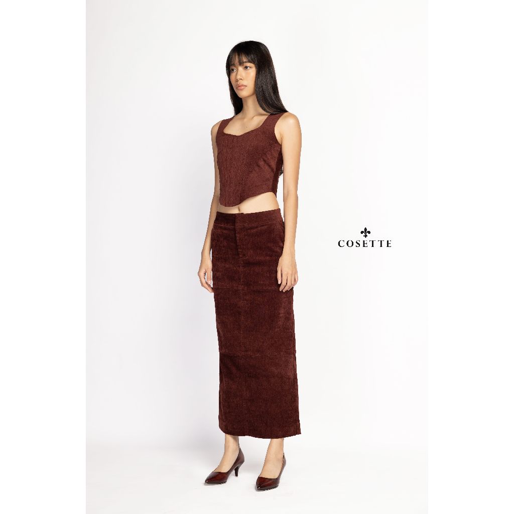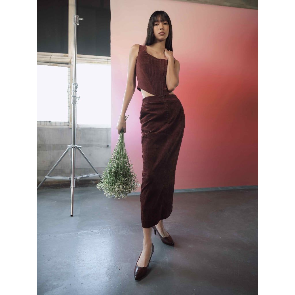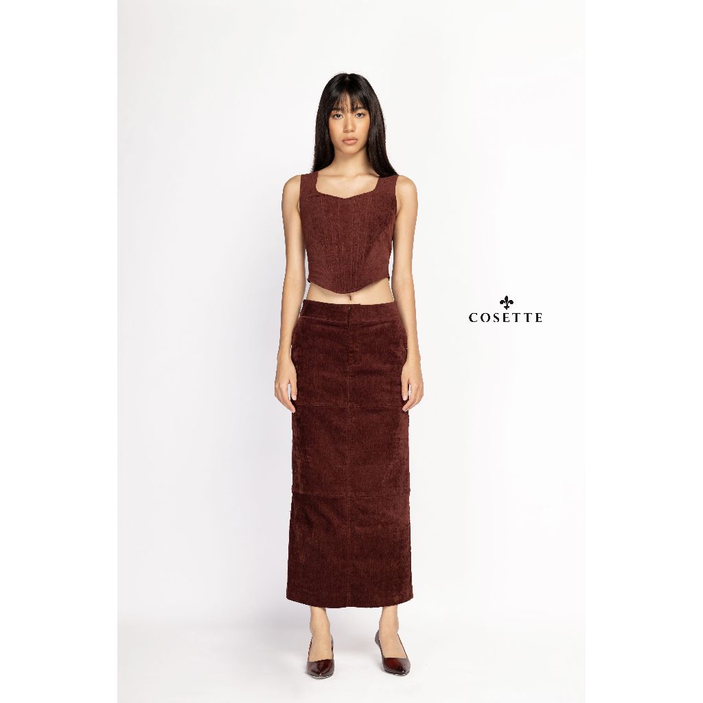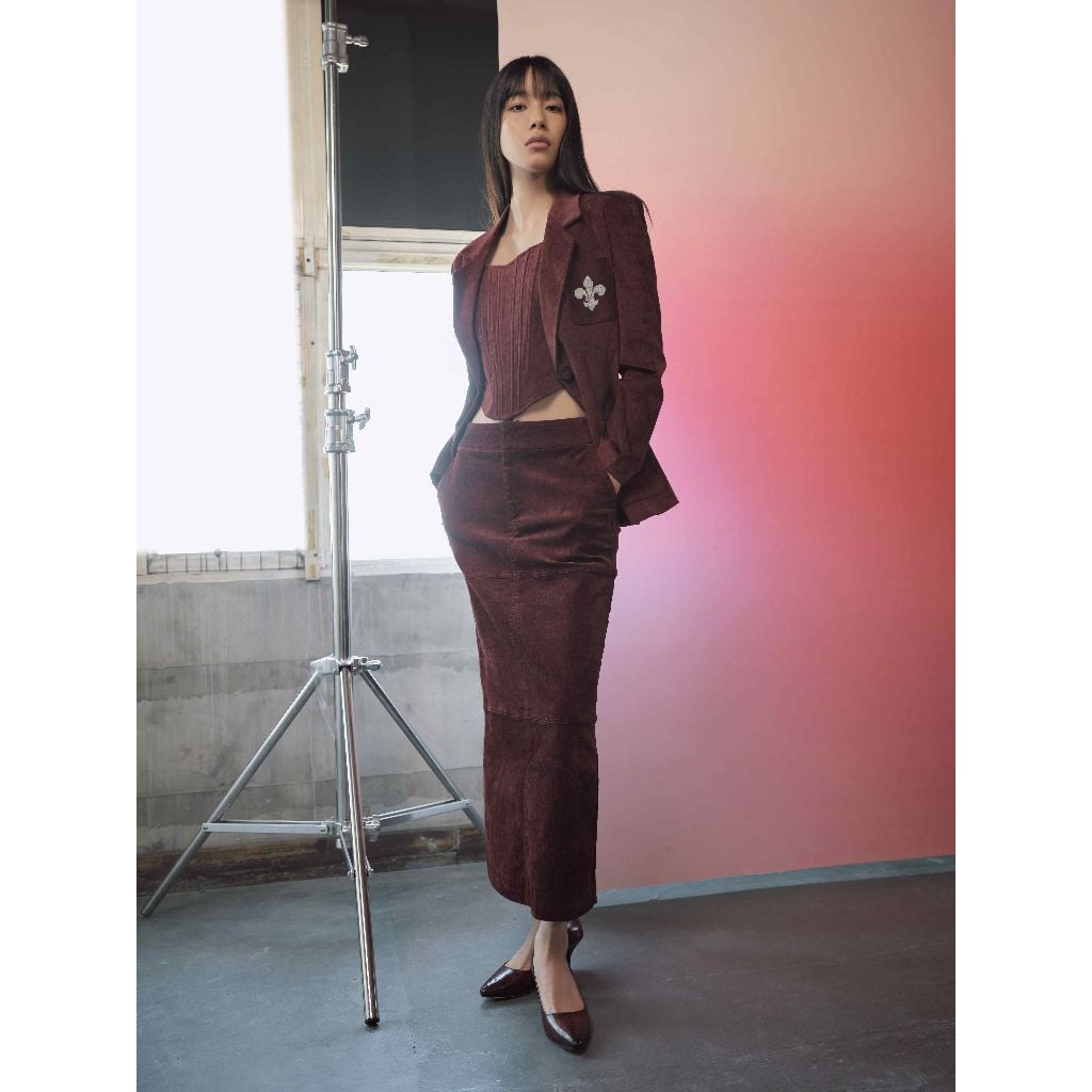 Áo vest 3 túi đắp - Áo gọng nhung đỏ - Chân váy rã thân nhung đỏ