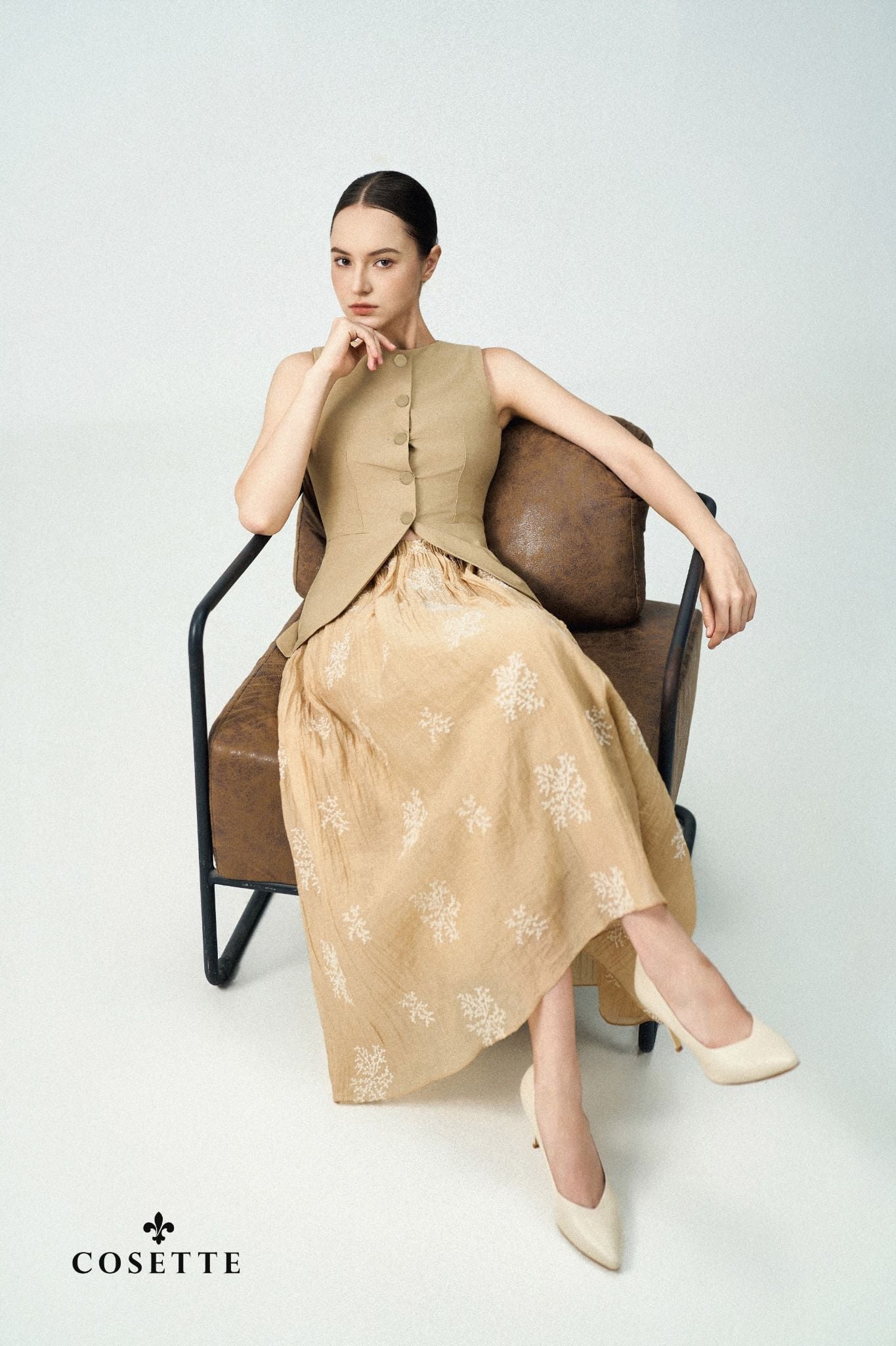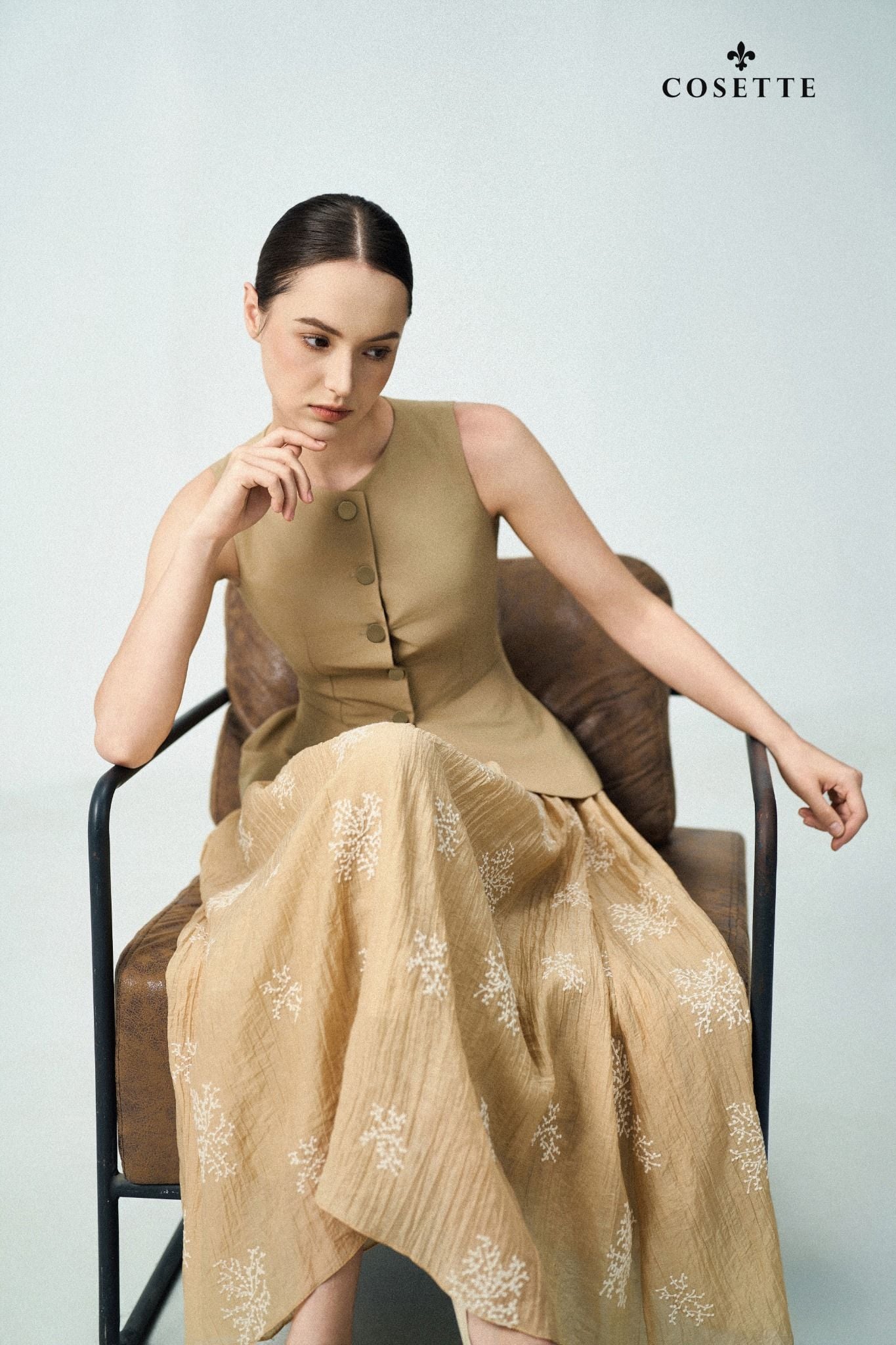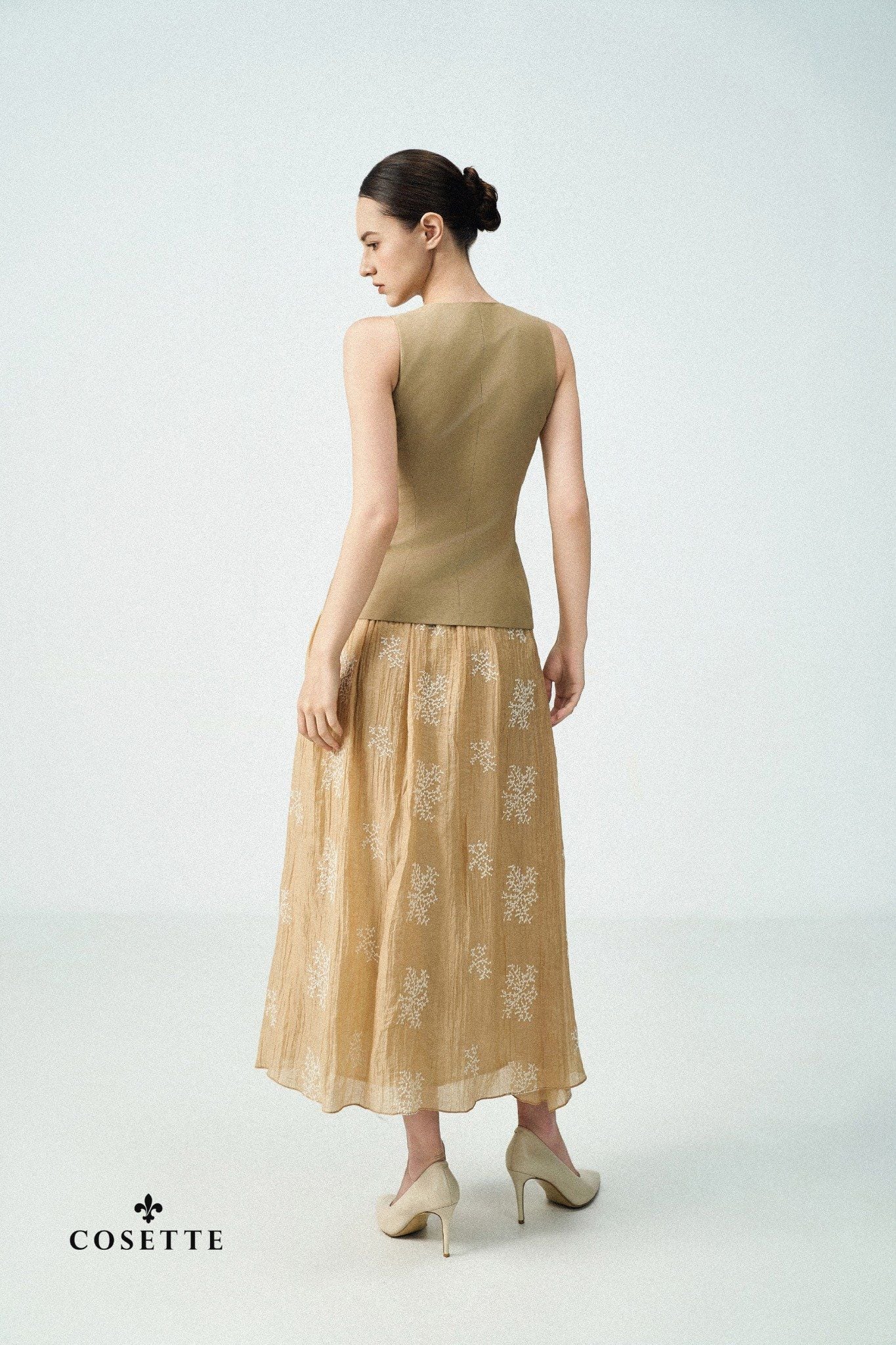 Chất liệu: Chân váy được chế tác từ chất vải cotton pha lụa cao cấp, xử lý nhăn tự nhiên giúp tạo độ mềm rủ và bề mặt sống động. Lớp vải chính được thêu họa tiết cành lá tinh xảo bằng chỉ màu kem, mang lại cảm giác thủ công và sang trọng. Vải nhẹ, thoáng khí, phù hợp với thời tiết xuân - hè, đồng thời giữ form tốt khi chuyển động.