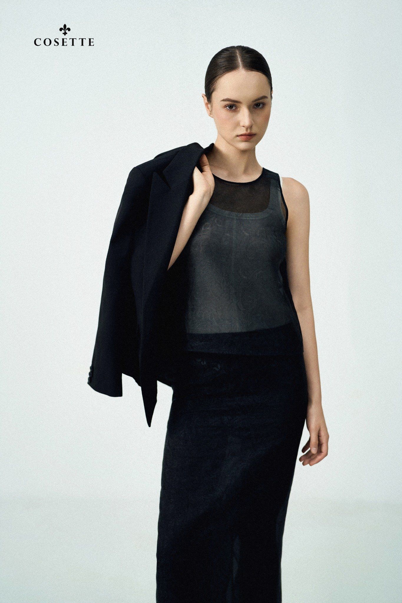 Phối cùng áo organza xuyên thấu đồng chất như trong bộ sưu tập để tạo thành set đồng điệu trang nhã.