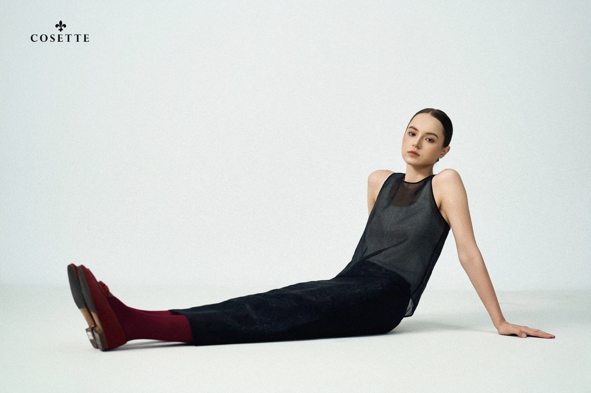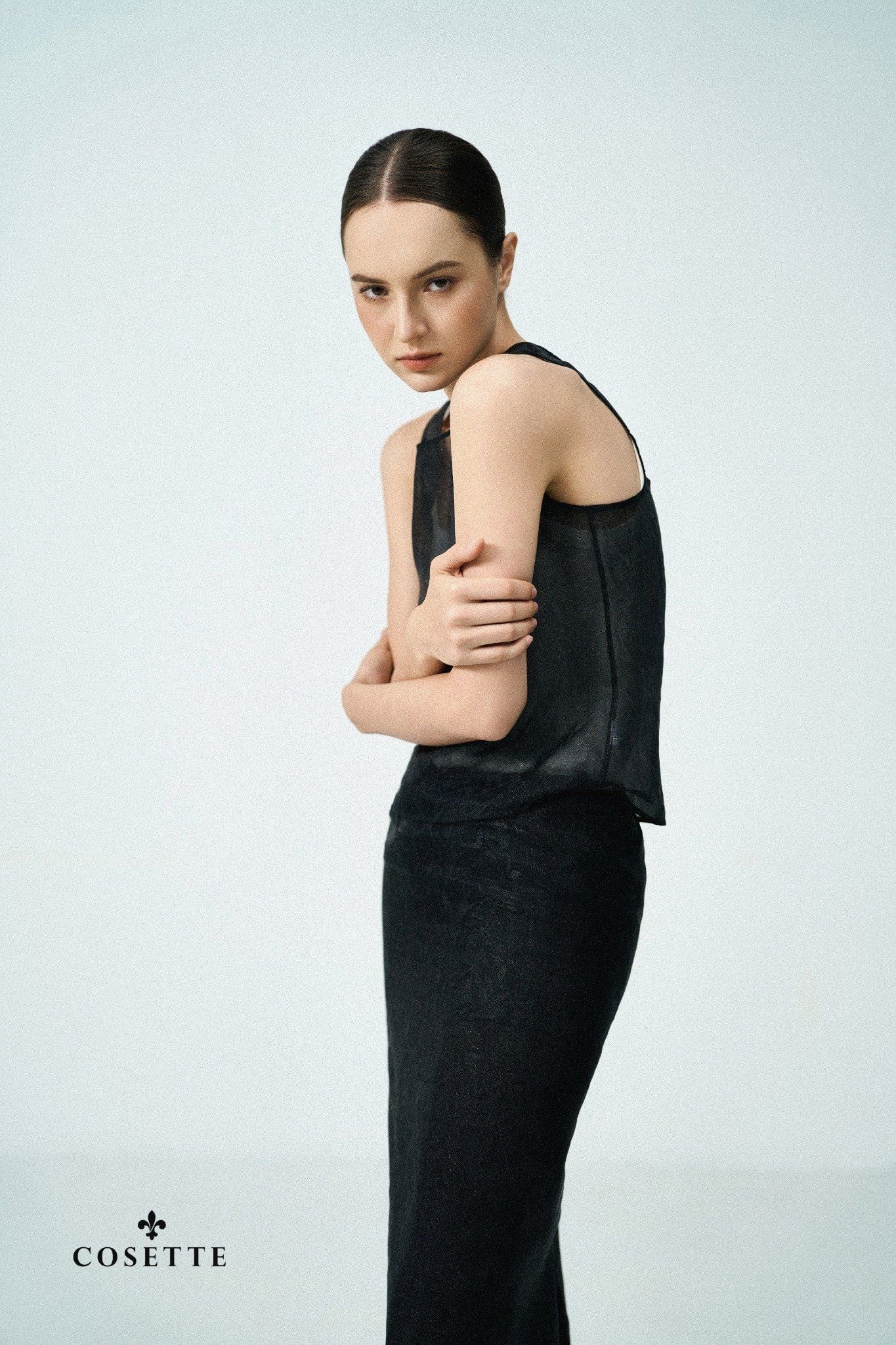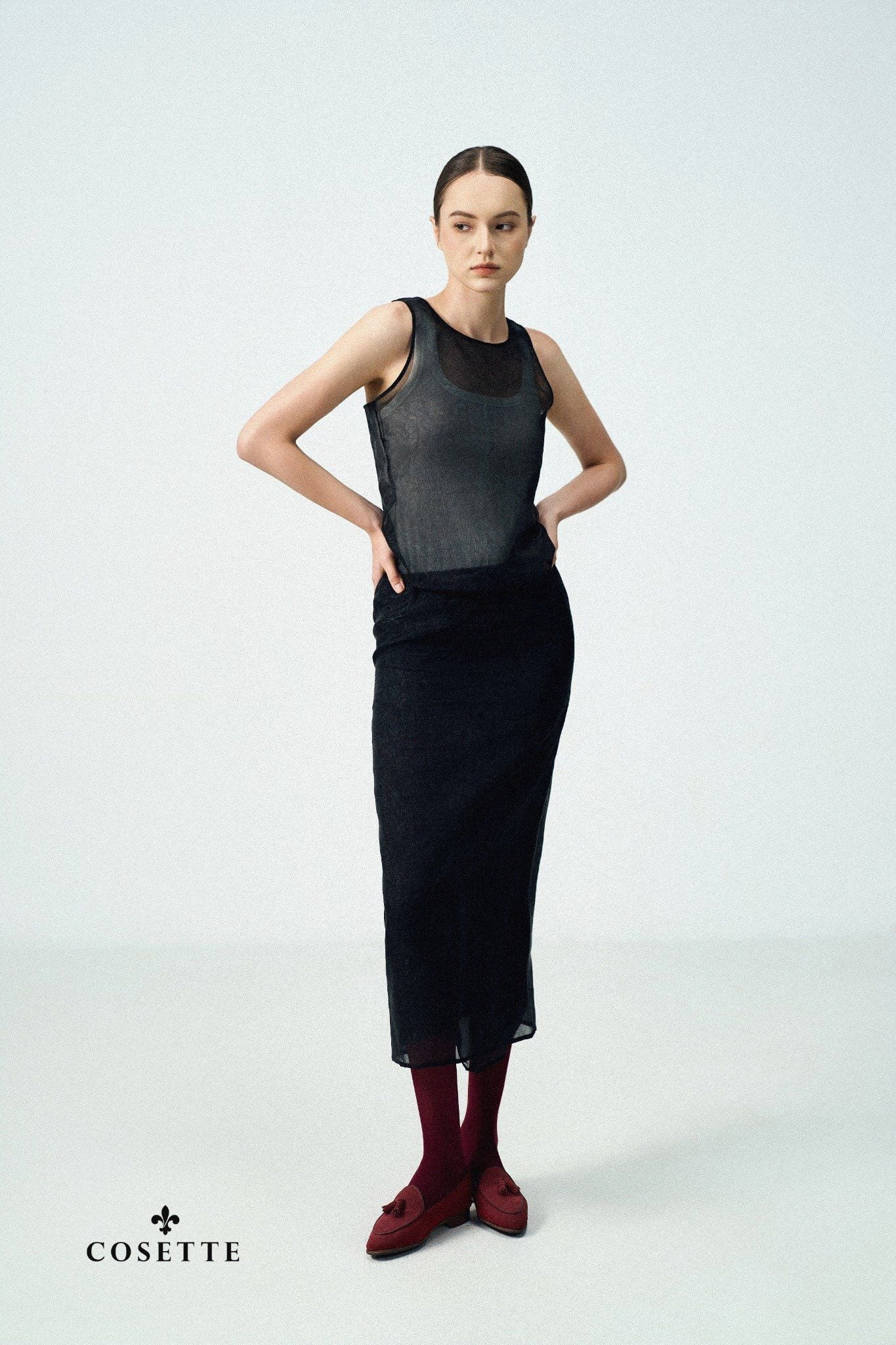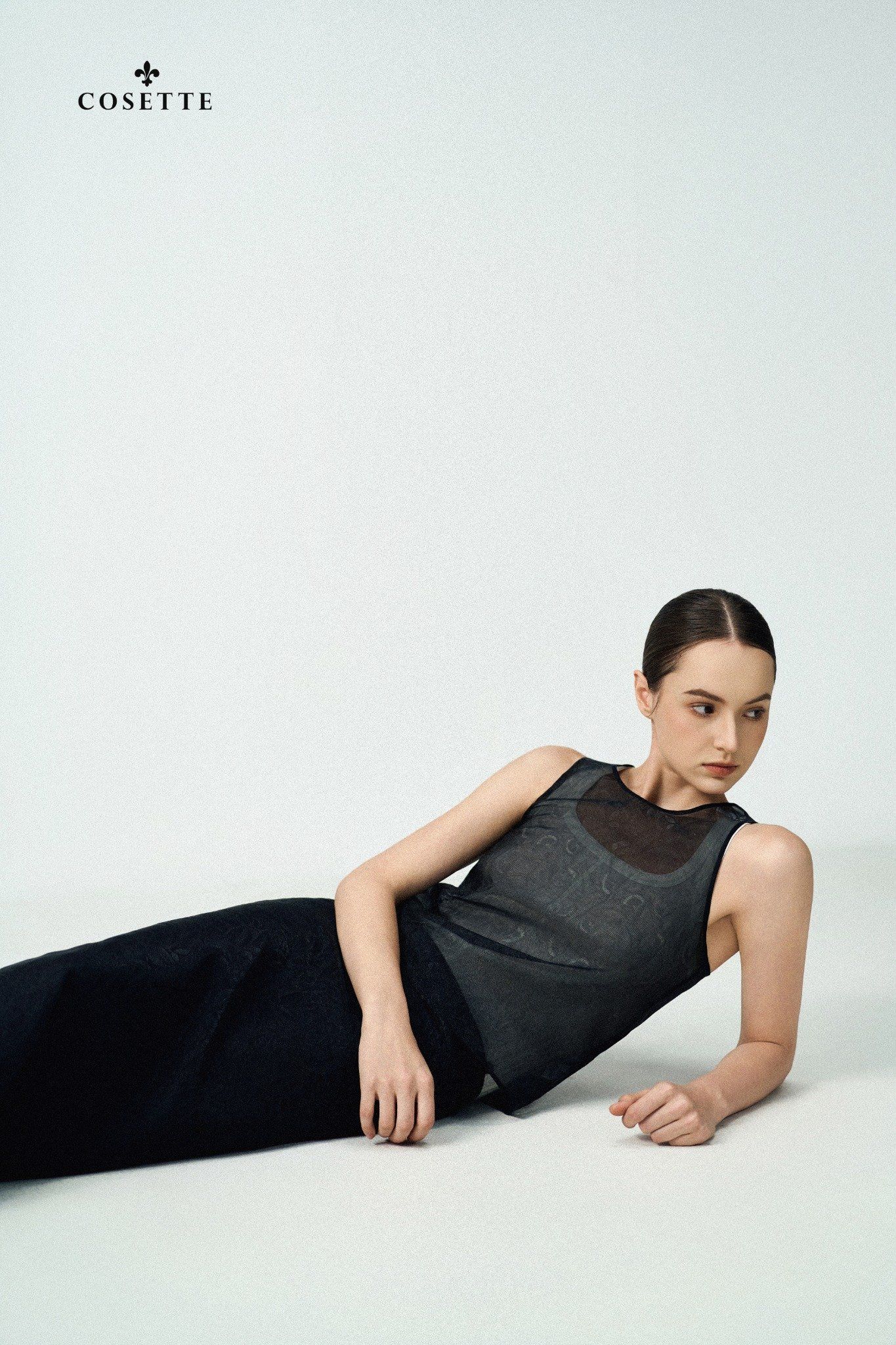 Phối cùng áo organza xuyên thấu đồng chất như trong bộ sưu tập để tạo thành set đồng điệu trang nhã.