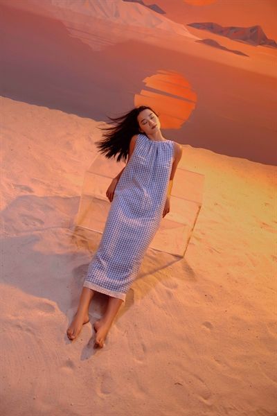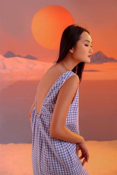 Đầm nhúng cổ hở lưng sọc caro xanh